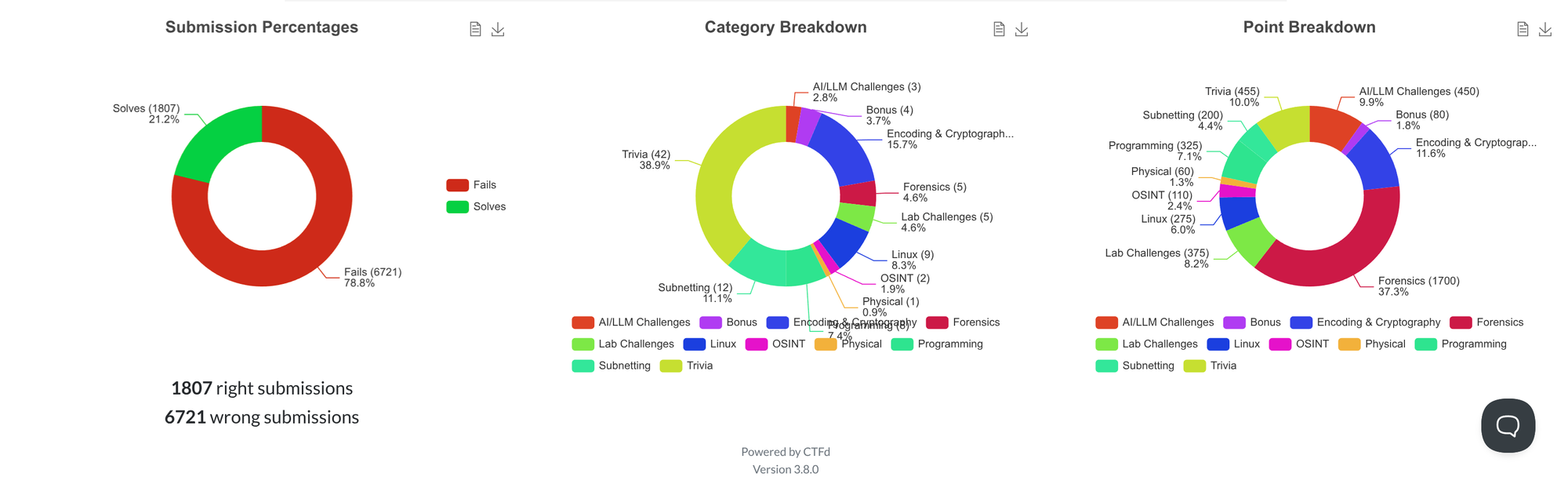Students competed within their respective High School for first place, solving challenges from various categories such as Software Forensics, Trivia, Encoding, Cryptography, Subnetting, Programming, Linux, Open Source Intelligence (OSINT), and AI/LLM Challenges.