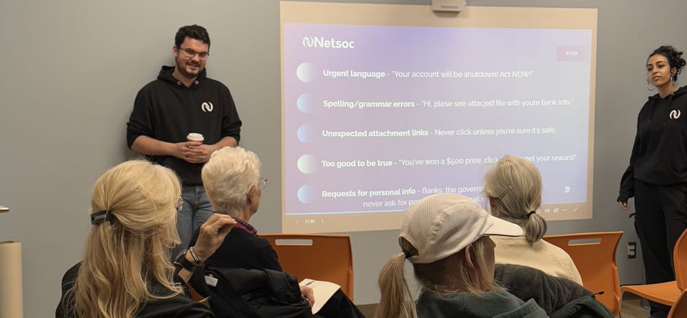 On November 11 2025, Netsoc associates Haneen Al-musowi and Keegan Gratton proudly hosted our “Staying Safe Online” event at Delpark Homes Centre. The event was informative, giving everyone the opportunity to learn about what it takes to protect themselves online. Netsoc associates spoke about common ways everyday users are misled online, how to spot these red flags, and lastly how to be proactive against these threat actors.
