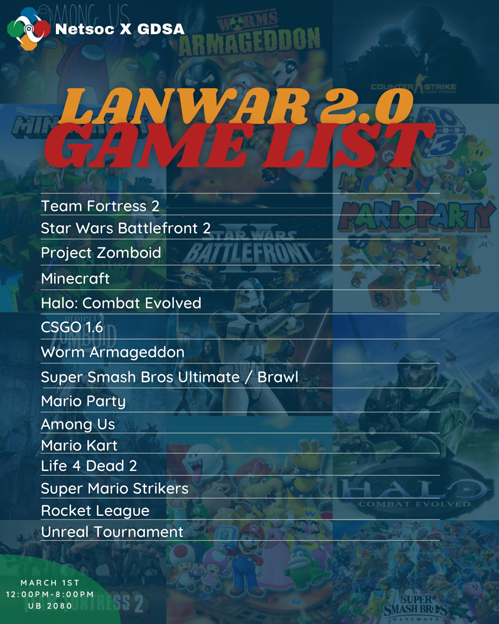 LAN WAR 2.0 is almost here, and we’re excited to reveal the full game lineup for this year’s on‑campus LAN hosted by Netsoc in collaboration with the Game Dev Student Association (GDSA).